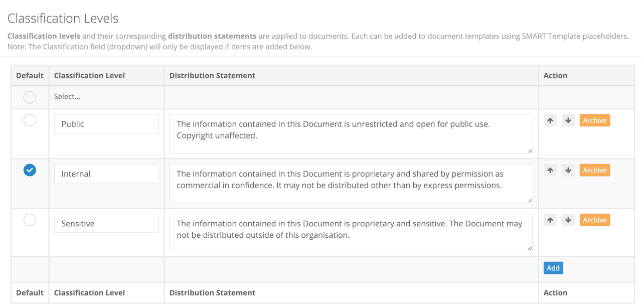 Use the Add button to create new levels, then populate each with a Classification Level and the Distribution Statement.