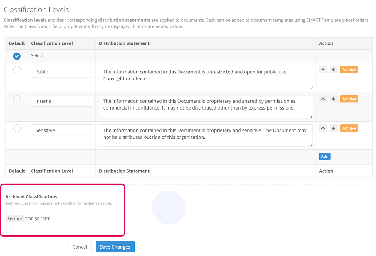 Edit and Archive Classification Levels