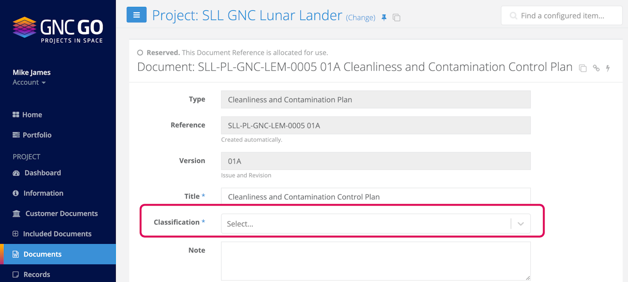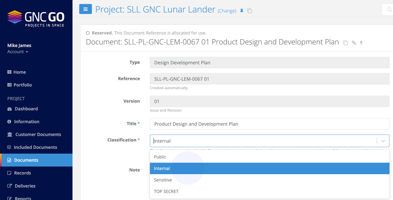 New Reserved Documents are automatically assigned the defined Default Classification level, but Classification level can be changed any time the Document is in Reserved status.