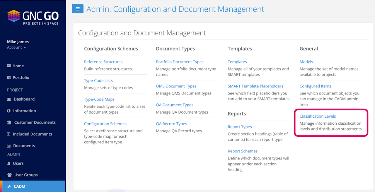 From the CADM Admin | Classification Levels screen: